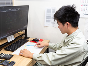 お客様から受注した水処理設備の機械の設計を行っています。具体的には除塵機やコンベア、ホッパーなどです。基本的に一つの機械につき一人で設計を行い、まずはお客様に直接会い、要望をヒアリングします。現地で施設の計測なども行います。要望や施設の大きさに合わせて図面を起こし、図面ができたら、工場部門へ渡します。工場の製造が始まってからも、図面がわかりにくかったりする場合は調整を行います。