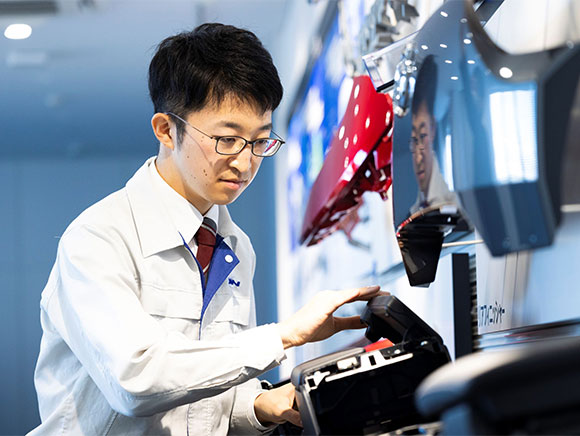 内装部品の設計をしています。新車種の開発では、お客様が求めるデザインの実現に向けて組立方法を検討したり、スペック・法規を満足しているかを確認しながらCADデータをつくります。自動車メーカーの設計担当者とタイムリーに打ち合わせを重ね、双方の認識にズレが生じないように進めています。量産車種の改善では、工程の見直しや安価な材料への切替えなど、利益貢献のための提案をします。対応が早いほど利益につながるため、正確かつ迅速な対応に努めています。普段は設計起案業務が多く、社内で円滑に業務を進めるためFace to Faceでの打ち合わせを意識しています。