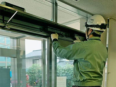 自動ドアを安全に使用していただけるように、保守契約をしている自動ドアの定期点検を行っています。故障の兆候や欠陥の早期発見をするうえでも大切な作業です。また、故障の連絡があれば、修理対応も行います。
