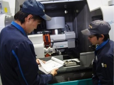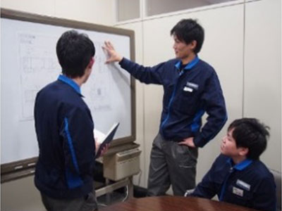 | 9:00 | 営業部との打合せ | 機械の仕様などを担当営業者と打合せ。どのような研削物を加工するのか、レイアウト、ツーリング、お客様の要望など営業担当者と入念に確認。 |