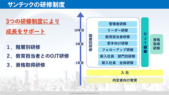 内定者通信教育、新入社員全体研修、新入社員部門別研修、フォローアップ研修、若手社員研修(3年目)、教育担当者研修、リーダー研修、管理職研修