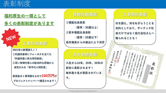 独身寮、家賃補助制度(適用条件有)、財形貯蓄、従業員持株会、退職年金制度、企業年金基金、総合福祉団体定期保険、社員表彰制度(工事表彰、模範社員、永年勤続)、育児・介護休業制度、河口湖別荘、社員親睦会、定期健診オプション検査費用補助、団体長期障害所得補償保険(GLTD保険)