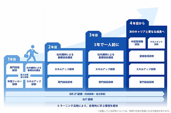 職能別・階層別教育、社内基礎技術講座など、社内研修や社外研修を通じて、実務だけでは学ぶことのできない様々な知識、能力の育成を図ります。