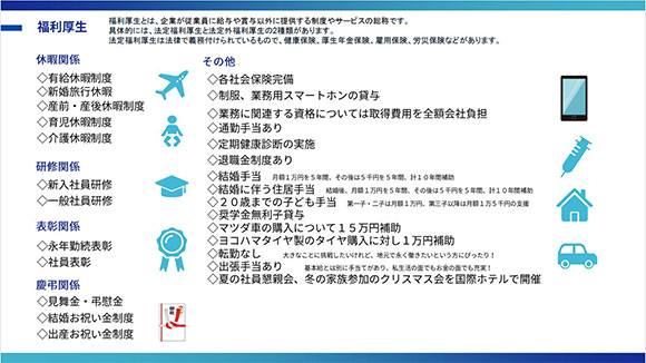 一般的な休暇や慶弔関係の福利厚生の他にも、働く社員の毎日が充実することで、会社も仕事もより良いサービスを提供できるように、健康経営に取り組むなど、働く環境を整えています。