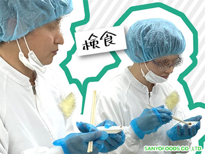 | 9:30 | 検食 | 常に美味しくて安全な商品を提供できているかを確認するために、検食が日常業務の一部として組み込まれています。ここでは、製造便によるばらつきや、時間の経過に伴う形状や味の変化を確認しています。 |