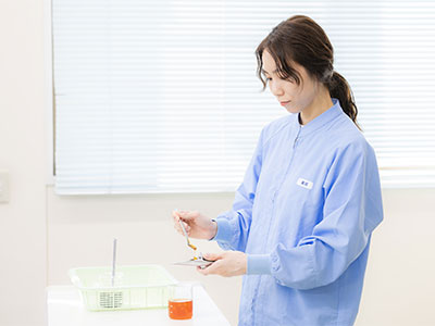 スイーツに使われるフルーツソースやプリンに入っているカラメルソースなどの開発を行っております。コンビニやスーパーに並ぶスイーツ商品、外食産業で使用されているソースなど、幅広く携わっています。お客様から「○○なソースが欲しい」という依頼を頂き、「もっと果肉を増やしてほしい」、「もっと酸味をつよくしてほしい」といった要望に応えながら開発を進めています。お客様と何度もやり取りを繰り返し、ひとつの商品を作り上げています。