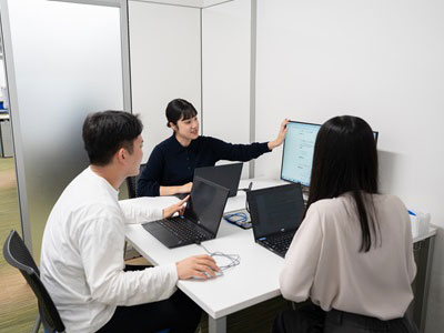 | 13:00 | 内部進捗会議 | プロジェクトメンバーで集まって内部進捗会議を行います。それぞれの作業進捗状況の共有や、午前の打合せで出た新たな課題の認識合わせを行うことで、その後の流れや役割が明確になり、プロジェクトがスムーズに進行します。 |