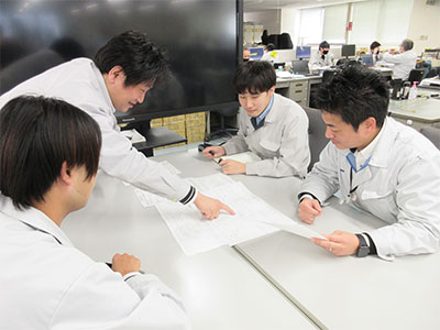 | 11:00 | 課内ミーティング | 担当業務の進捗報告を行い、課内で共有することで、業務の「見える化」を行います。先輩や同僚と意見交換をする中で、課題解決のヒントを得ることも。 |
